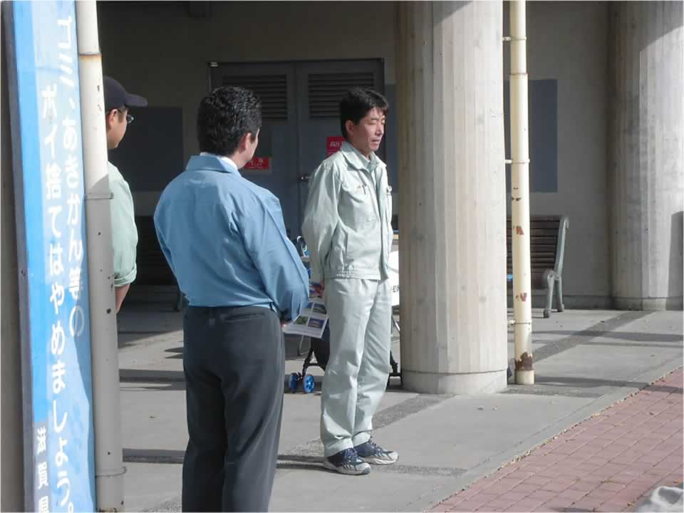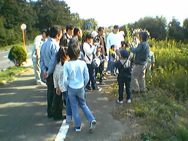 環境マスターの今村さんと青木さんから地域の自然についてお話を聞いて、工事現場へ向かいます。 マルセイ建設株式会社の中島さんから、工事について説明とお話をききました。 |