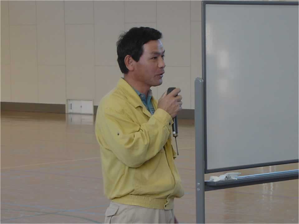 地域住民の方など40人の参加により、奥びわスポーツの森にて午後1時半からプログラムが開始されました。 マルセイ建設株式会社の鈴木さんからオープニング挨拶がありました。 |